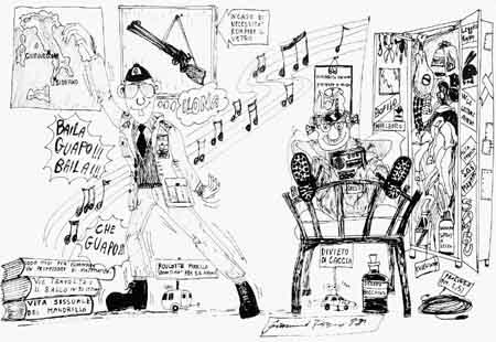 sollevando nuvoloni di polvere. Baffo incolto, sguardo, come dire, da... fama ed un passo
